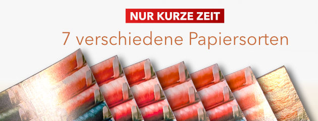 - Wählen Sie aus 7 verschiedenen Papiersorten: FineArt Fotoposter 190g, Posterpapier 130g, Blueback Affichen 135g, Sihl Green GrafX 220g, Sihl IvoryColor 210g (matt), Hahnemühle Photo Rag® 308g oder Hahnemühle FineArt Baryta 325g.