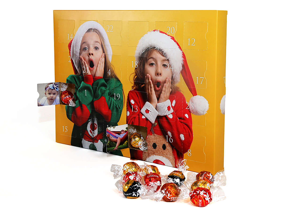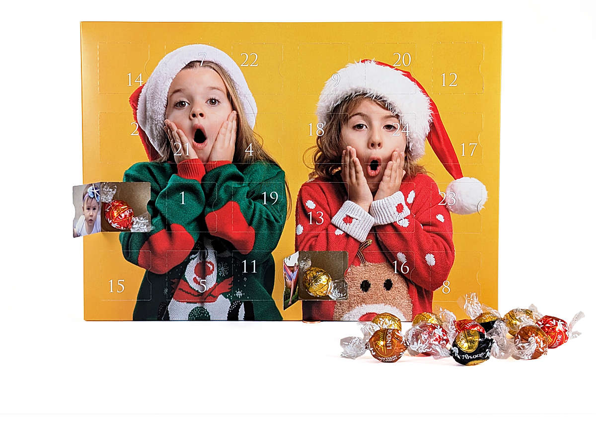 Gestalten Sie den Titel und alle Türchen mit eigenen Fotos. Ihr Adventskalender prall-voll mit exquisiter Lindt-Schokolade. Zart schmelzende Lindor Schokokugeln mit verschiedenen Füllungen. In den Sorten: Milch, Weiss, Extra Dunkel und Haselnuss. Für das Besondere Fest. Füllgewicht: 316 g.