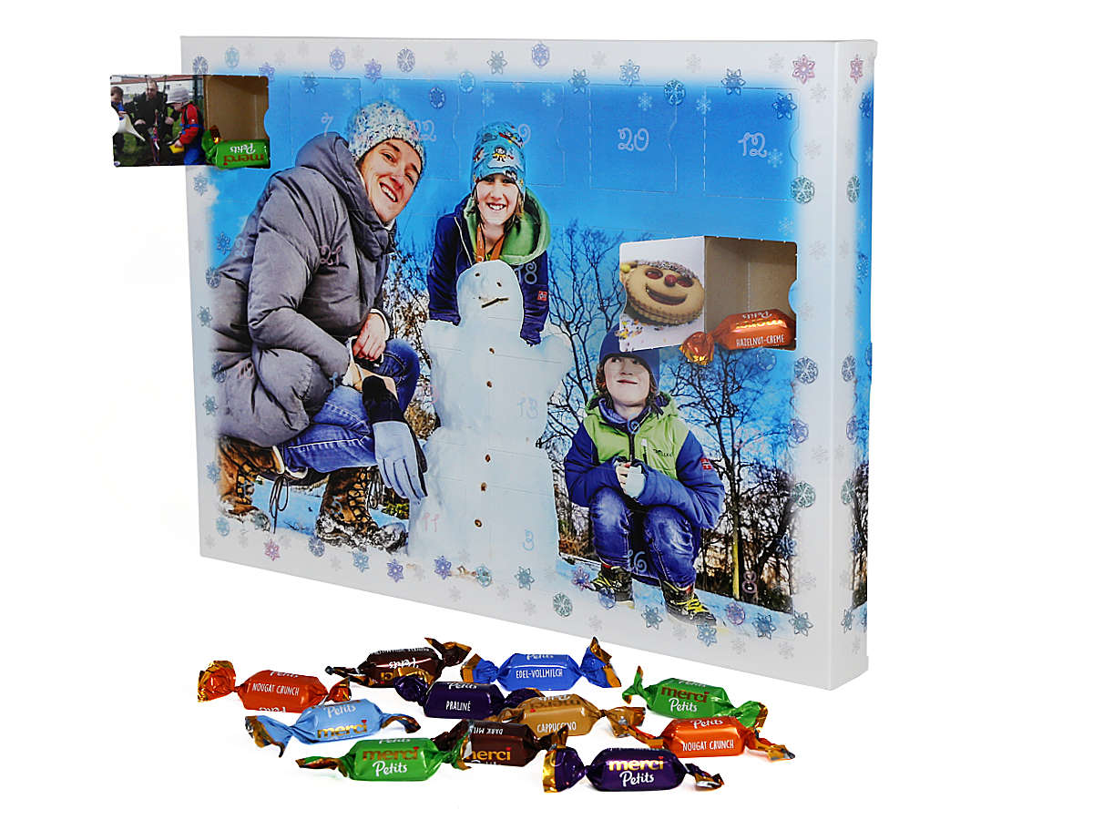 Gestalten Sie den Titel und alle Türchen mit eigenen Fotos. Unser günstigster Adventskalender fertig gefüllt, mit Ihren Fotos. Leckere Mischung von merci Pralinés aus gefüllten und ungefüllten Schokoladen-Spezialitäten in sieben Geschmacksrichtungen. Zum unschlagbar günstigen Preis. Füllgewicht: 143 g.
